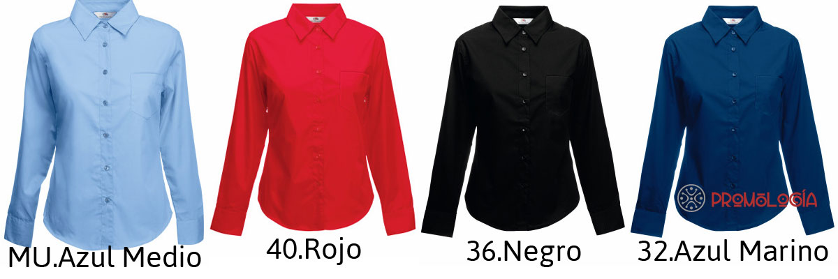 Camisa promocional de mujer, de manga larga y con bolsillo, fabricada con tejido 55% algodón y 45% poliéster, de 120gm/m² de gramaje.La personalización se recomienda en serigrafía en el bolsillo. Posibilidad de bordado o serigrafiado en otras posiciones.