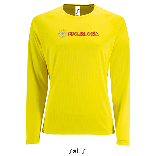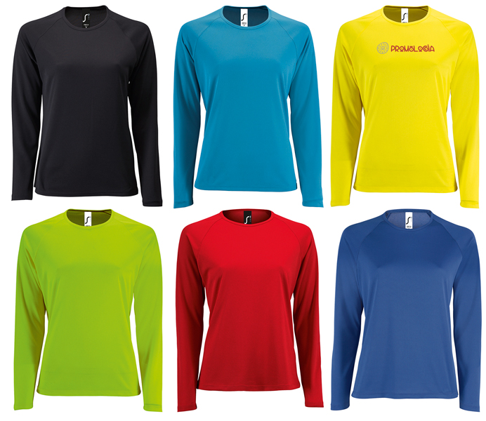 Camiseta técnica de manga larga de mujer, 100% poliéster con efecto transpirante, cuello redondo cortado y cosido con corte ajustado y dobladillo en el cuello. 140gr/m2.
