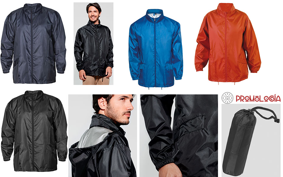 Chubasquero con cremallera completa, cordones ajustables y cuello alto.