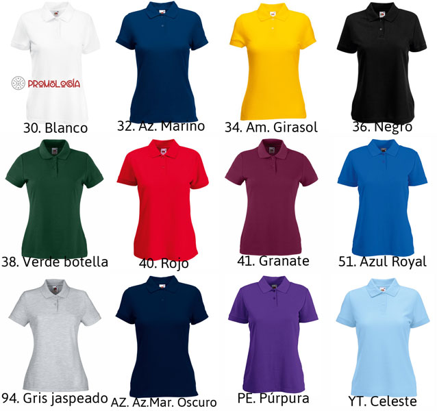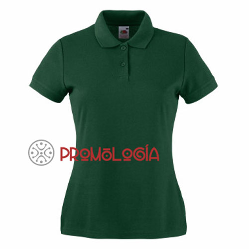 Polo promocional de mujer, de Fruit of the Loom, fabricado con tejido 65% poliéster y 35% algodón de fácil cuidado. Resistencia al lavado garantizada hasta los 60°C. Tapeta con dos botones del mismo color. Peso: Blanco – 170gr./m² Color – 180gr./m². Personalización en serigrafía en pecho (pequeña) o espalda (grande)