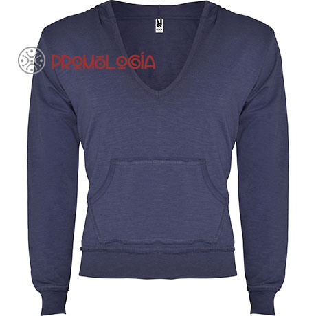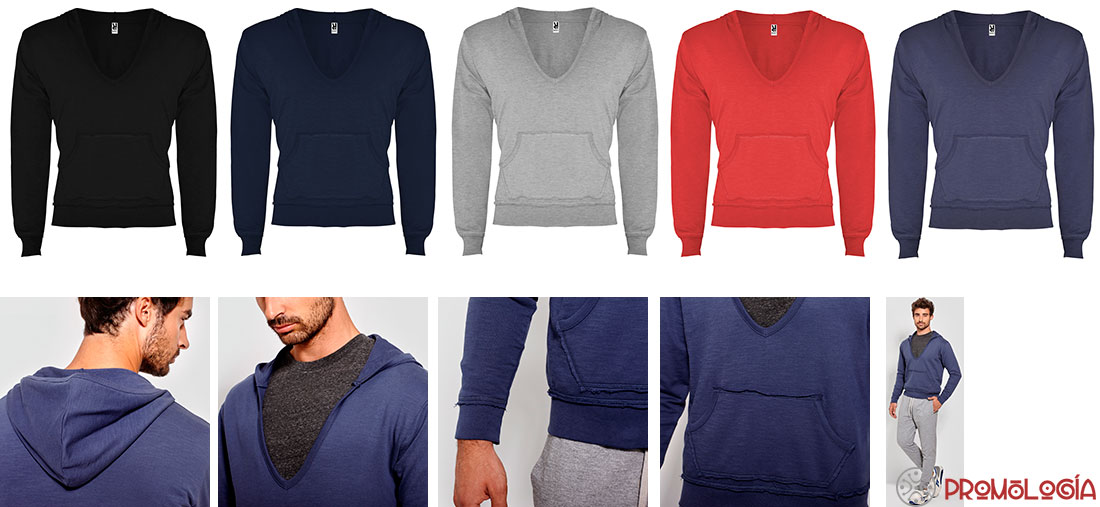 Sudadera publicitaria con capucha y escote pronunciado en forma de V, ribeteado en el mismo tejido. Bolsillo estilo canguro. Punto canalé con adorno de confección inacabada en puños y bajo. 100% algodón felpa no perchada, punto roto, 250 g/m² (color gris vigoré 58: 85% algodón / 15% viscosa) Etiqueta removible. En prendas oscuras, siempre que sea necesario, se cobrará un suplemento de 0,15 € por tinta en concepto de doble pasada con flash de secado.